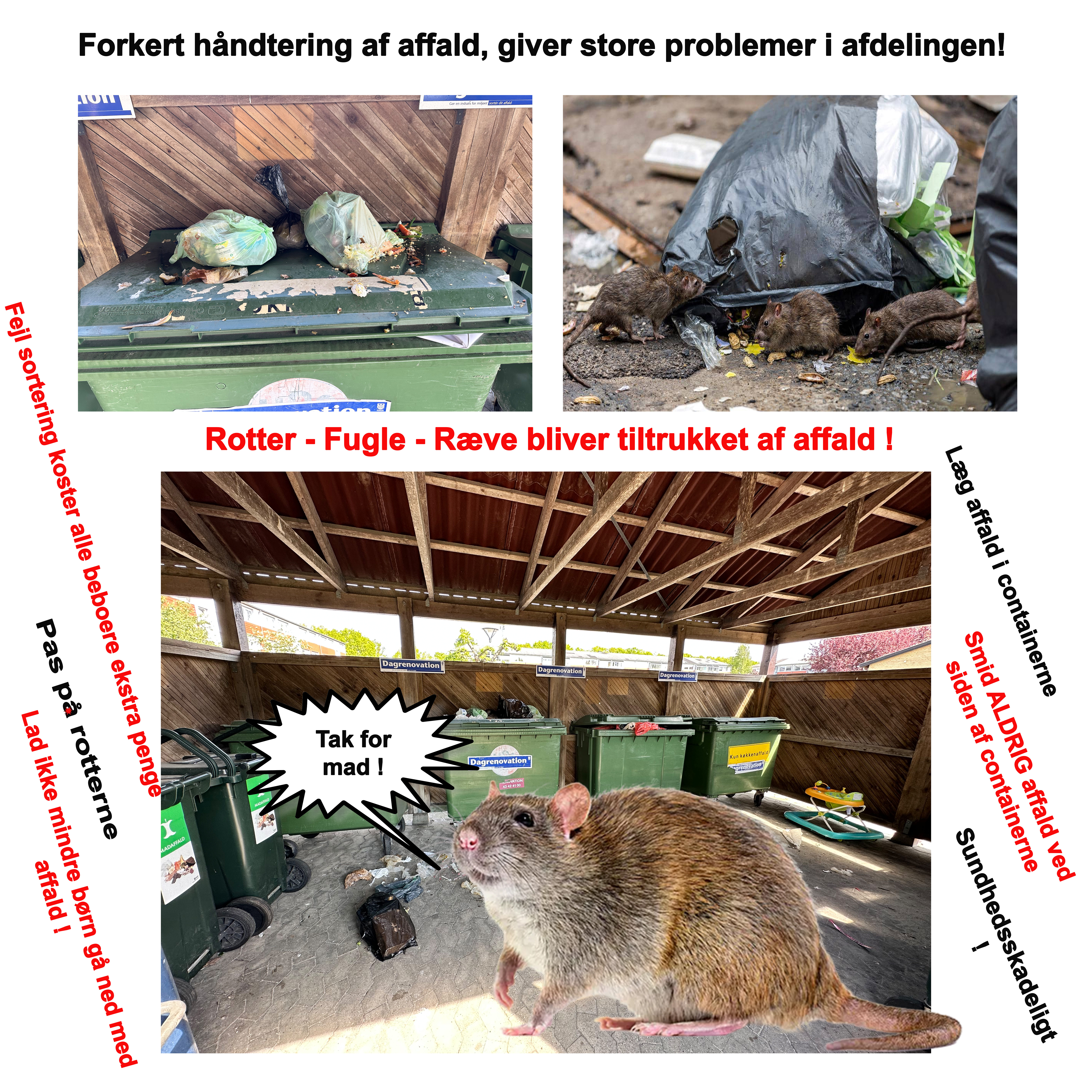 Vi har i mange år haft problemer med, at enkelte beboere ikke behandler skraldet som man skal, især her på det sidste er det gået helt galt i nogle af vores skraldeøer, og det er ikke alene meget ulækkert men også enormt sundhedsskadeligt.